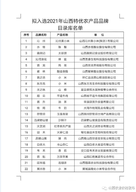 關(guān)于擬入選2021年山西特優(yōu)農(nóng)產(chǎn)品品牌目錄庫名單的公示